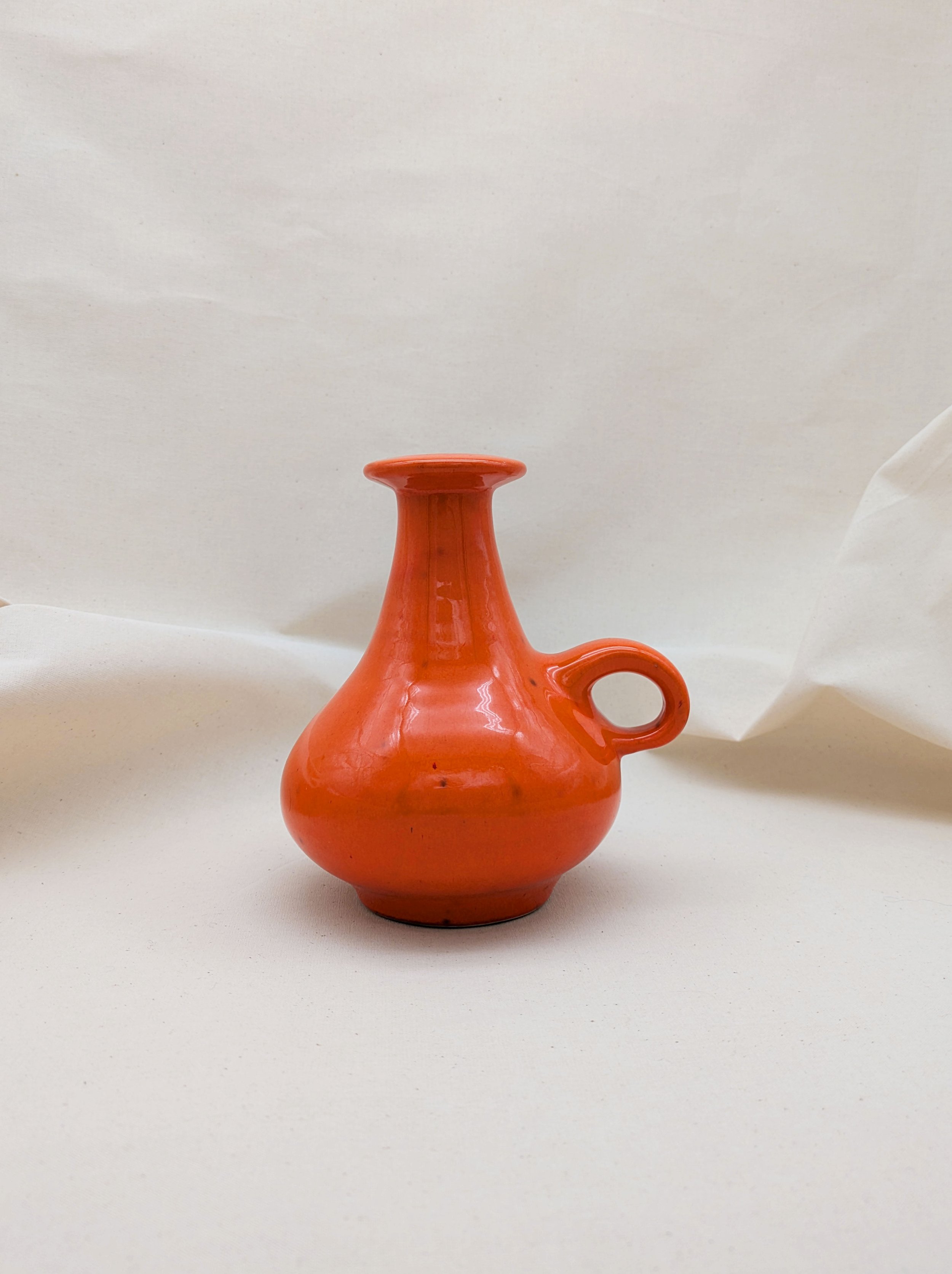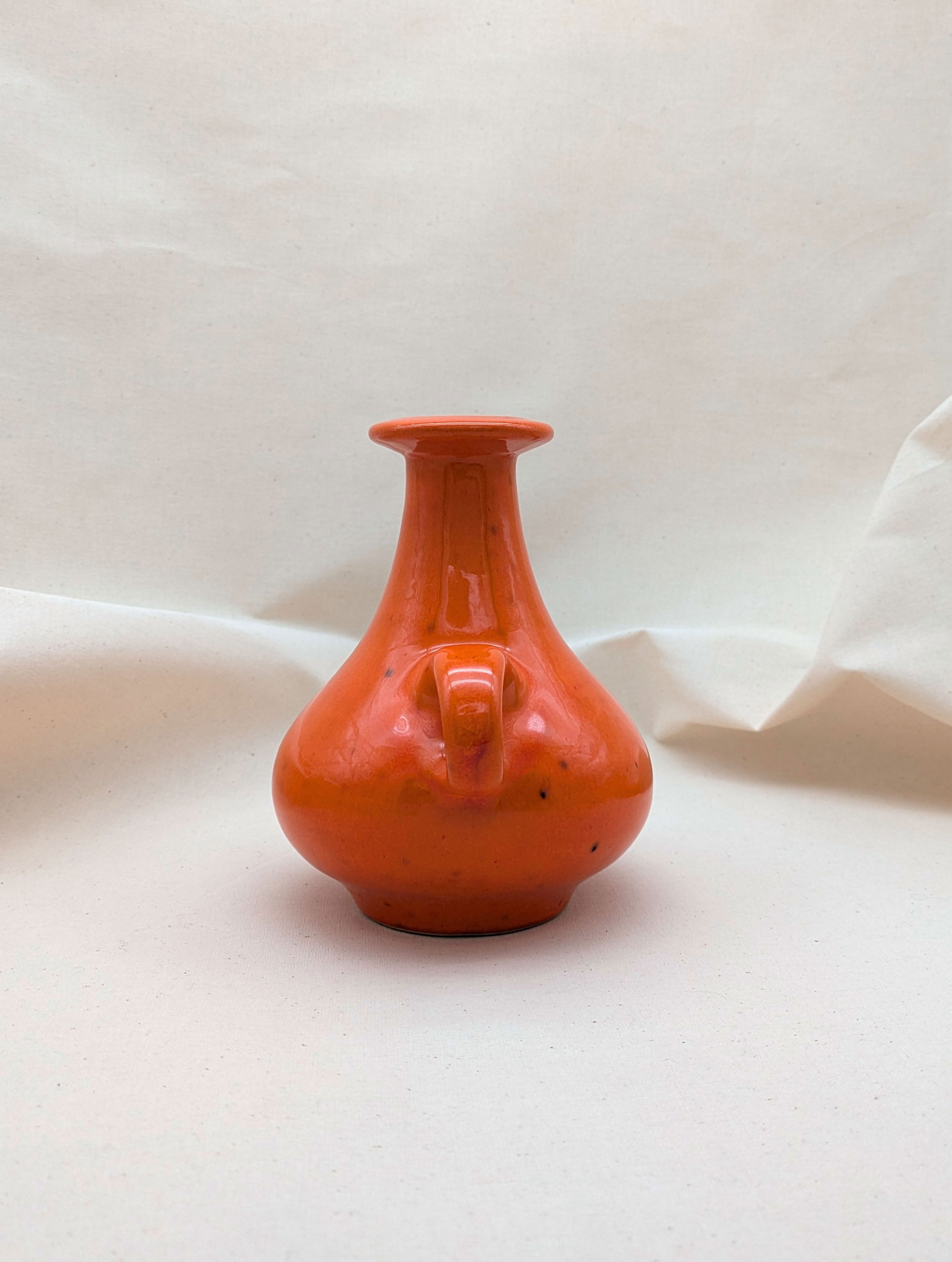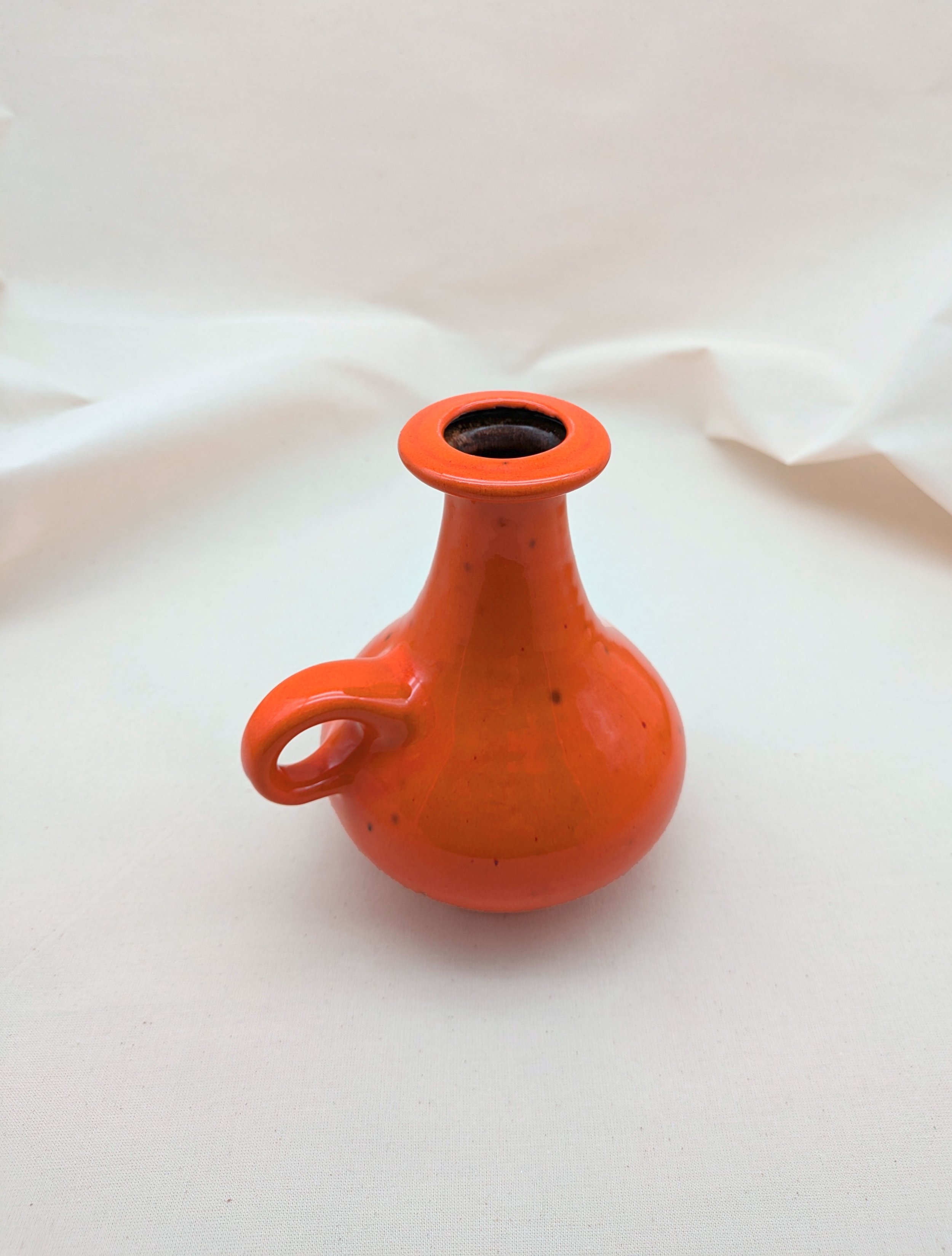 Small orange ceramic vase with handle from Manfred Buchholz studio, 1970s. Signed MB 418/15. Small, yet strong in colour with a vivid orange glaze - sure to stand out on your shelf.