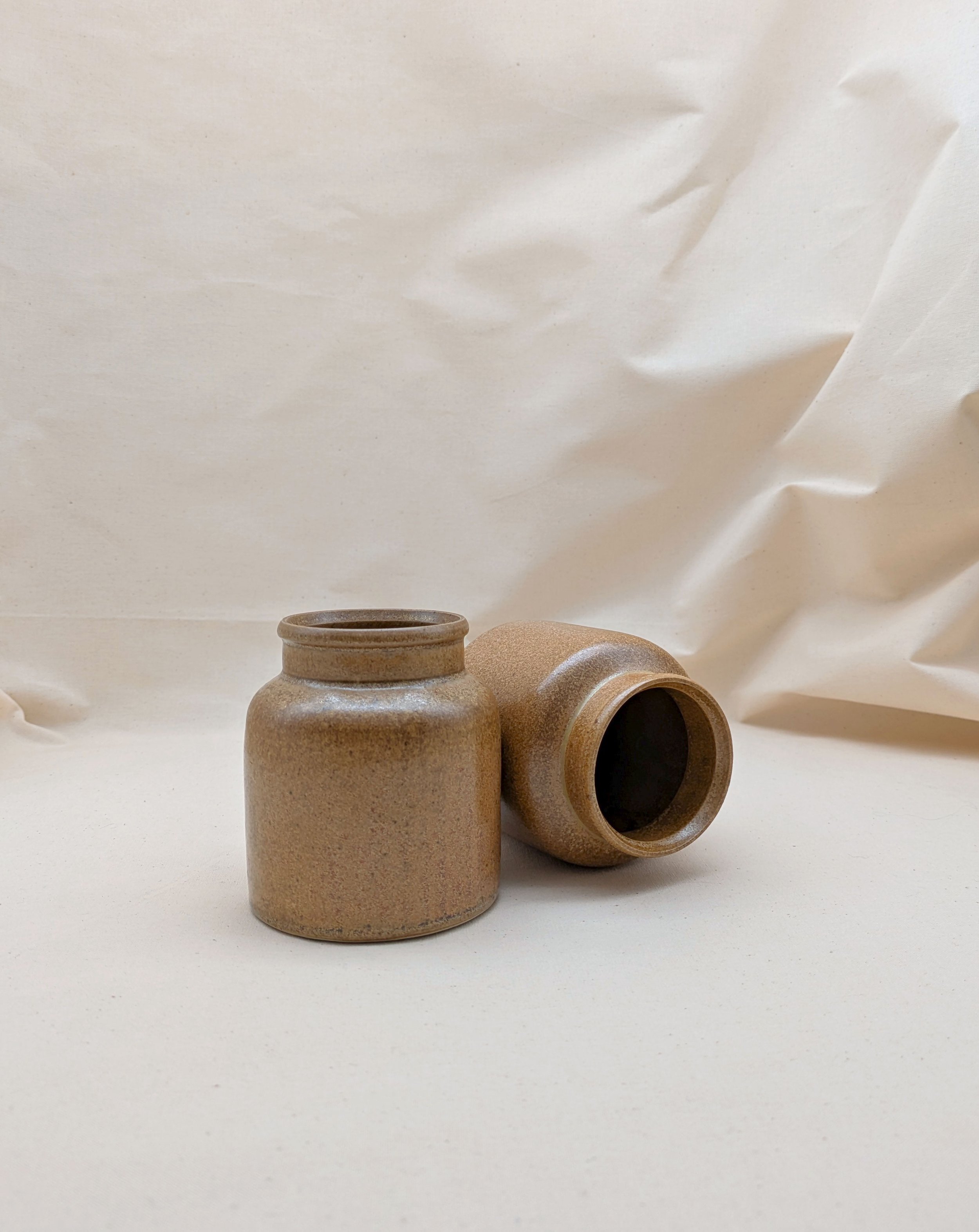 Pair of vintage stoneware mustard-jar-style vases in earthy brown with some speckles. Not for mustard or jams, but perfect for wild flowers or as sculptural decorative objects.