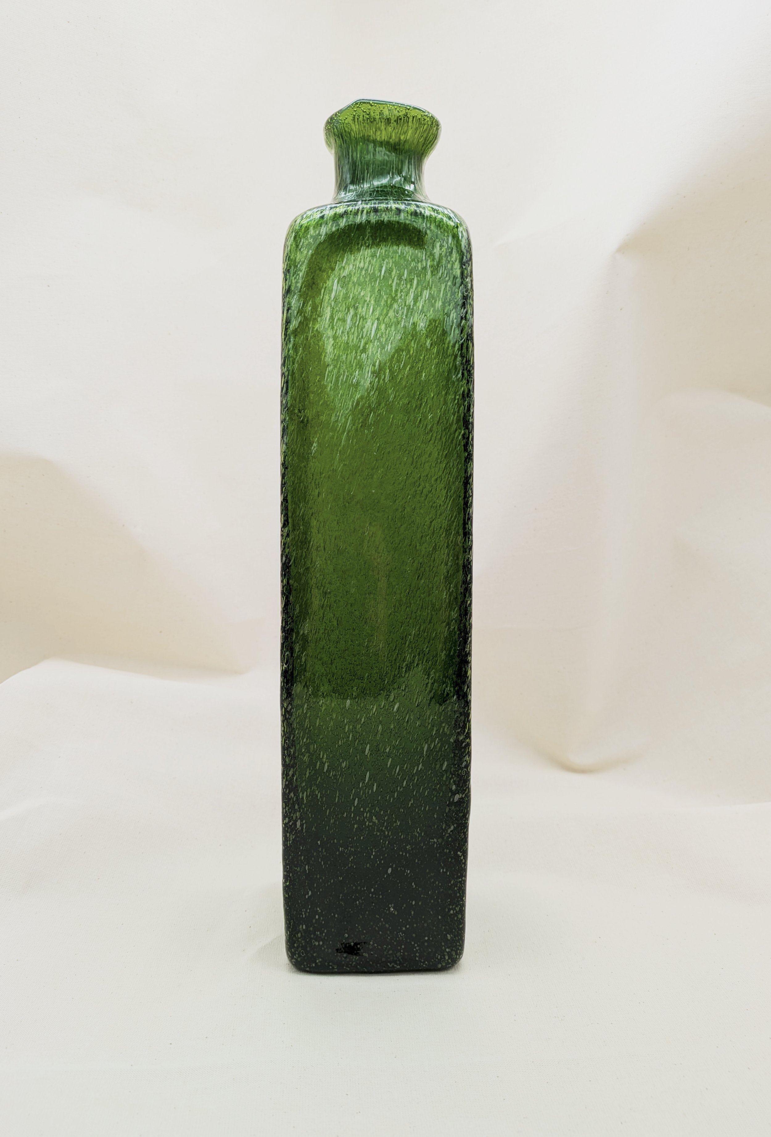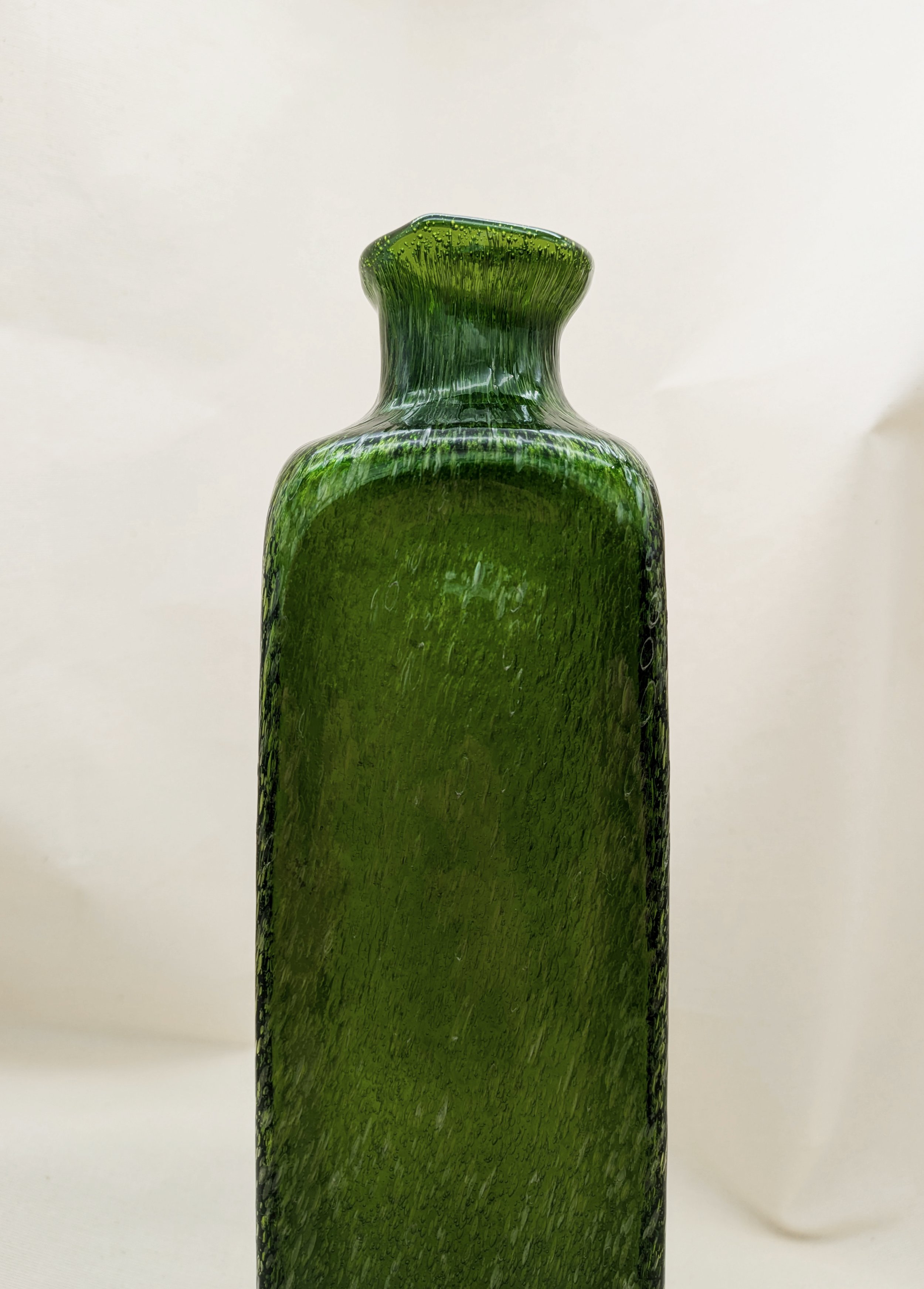 Rectangular bottle-shaped tall glass vase featuring a rare bubble texture throughout. Minor imperfections - darkened, web-like lines within the glass - usually only visible in certain light.